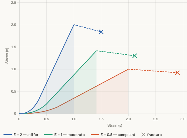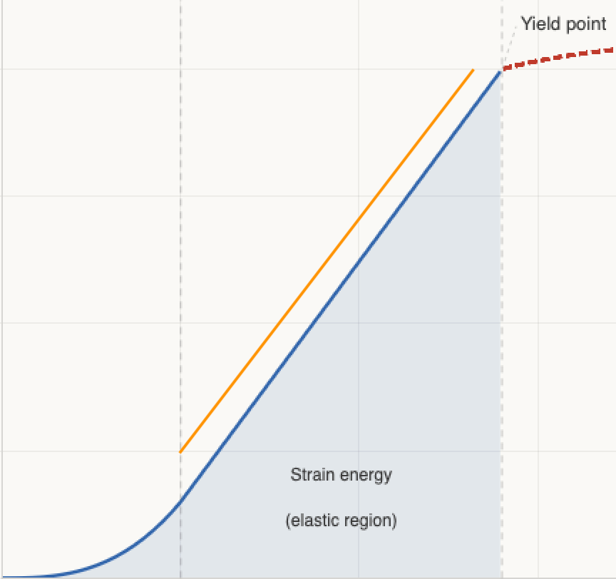 Lastingly, let’s define toughness. In order to quantify toughness of a tendon we need to measure the amount of surface area under the curve itself. This is a measure of strain energy, or how much energy the tendon can absorb prior to damage. A simplified equation for the amount of strain energy is Strain Energy = (Stress x Strain)/2. This value is a combination of our two major values, if a tendon that can stretch more, withstand more stress, or both, adds to its ability to absorb energy. A tissue that can absorb more energy without damage is tougher.