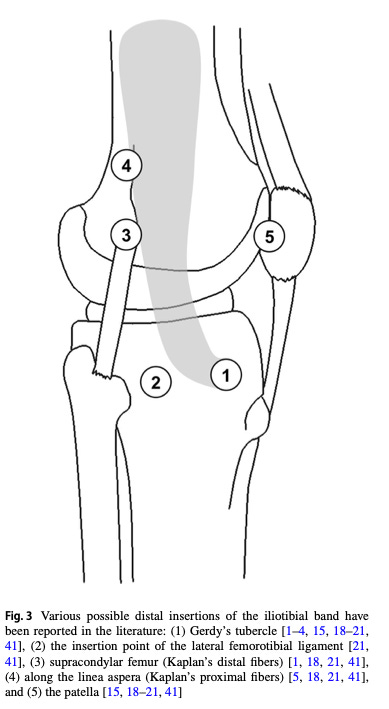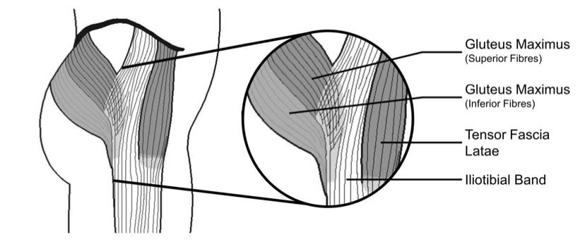 Tensor Fascia Latae and the superior fibers of glute max will attach into the proximal portion, the actual “band“ it’s self is a thickening of the fascia and muscular septum that runs over the quadriceps, and attaches to the many parts of the lateral aspect of the tibia, most notably Gerdy’s Tubercle. Meaning increased concentric orientation of the TFL and upper glute max will be able to externally rotate the tibia (and flex the knee depending on the position), bring the pelvis forward into an anterior orientation, as well as bring the iliac crest down towards the greater trochanter.